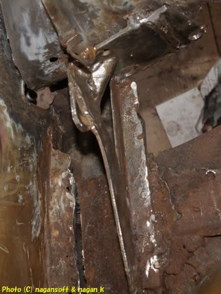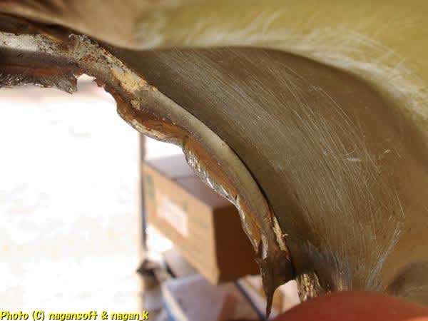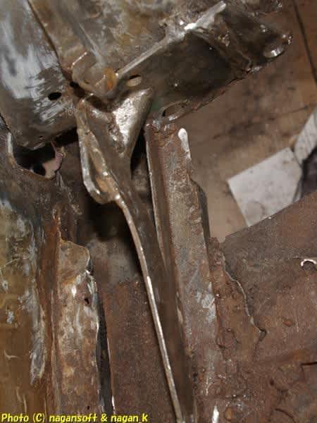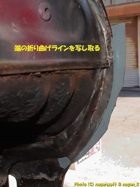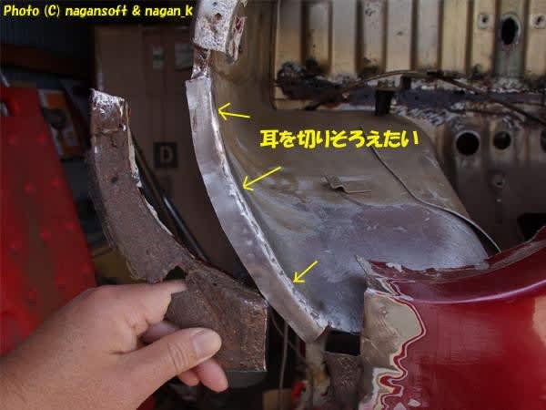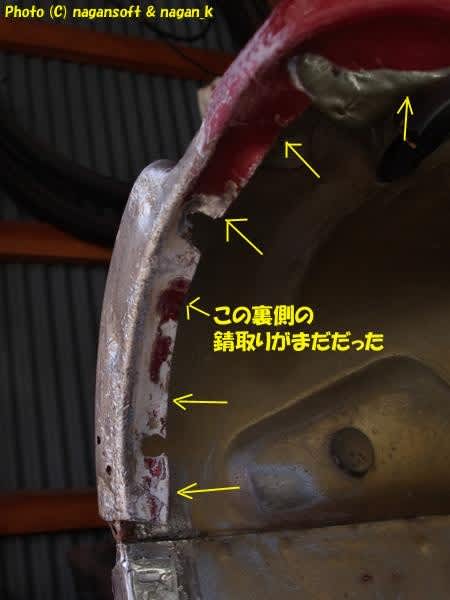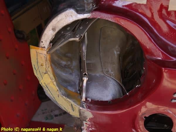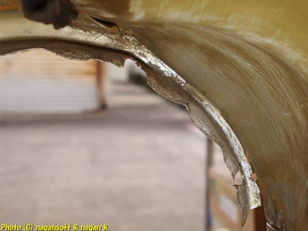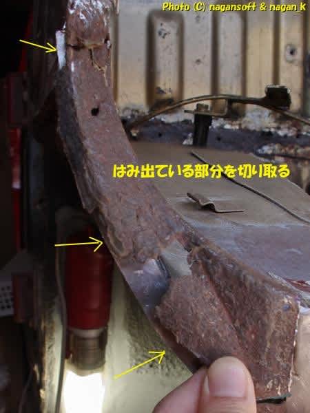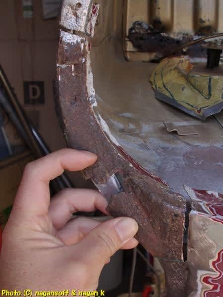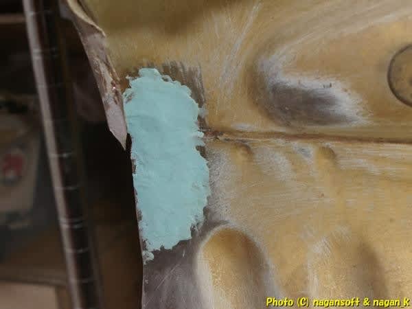 フェンダーエプロン先端の錆屑にて鉄が欠損した部分は、縁に鉄板を貼りつけるときにハンダにて埋めました。