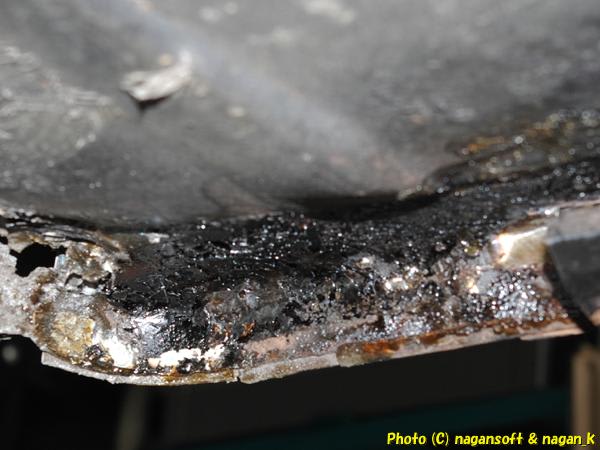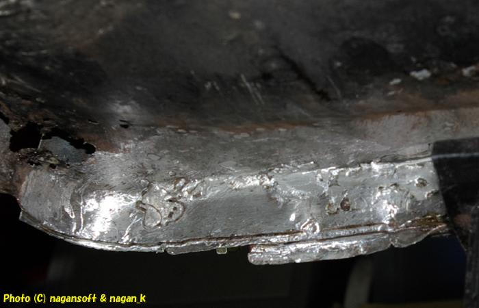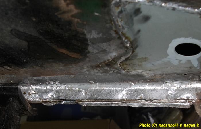 先頭部分に盛大なハンダ団子があるのですが、この団子は実質、室内側のサイドシルパッチ鉄板のアンカーも兼ねていると思うのでそのままにしておくことにしました。