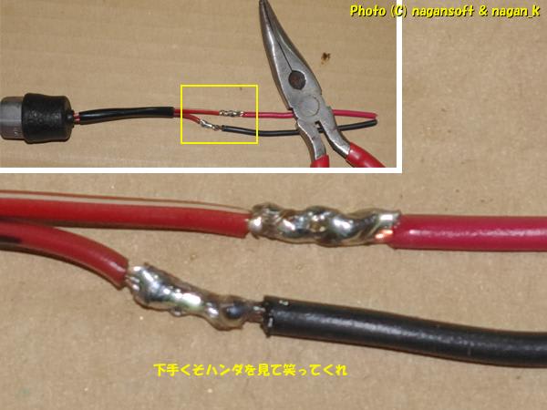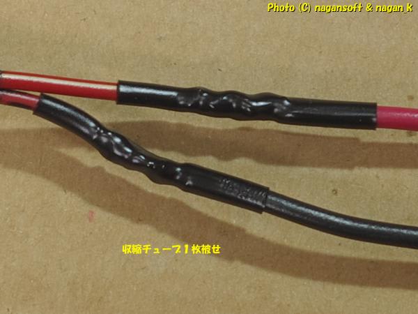収縮チューブで絶縁です。ヒートガンがあると収縮作業もお手軽です。
