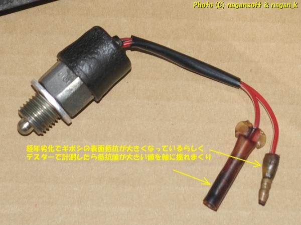 バックランプスイッチのギボシ端子が経年劣化で抵抗値があがっている(要するにキボシが酸化腐食している)らしく、テスターで通電テストしたら高い抵抗値を基準に大きく数値が揺れ続けたのです。