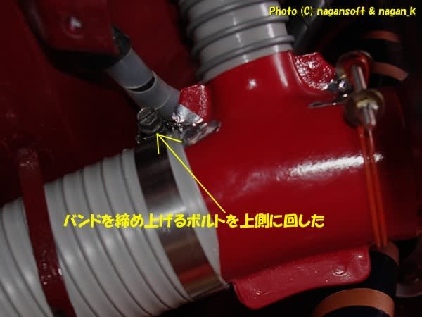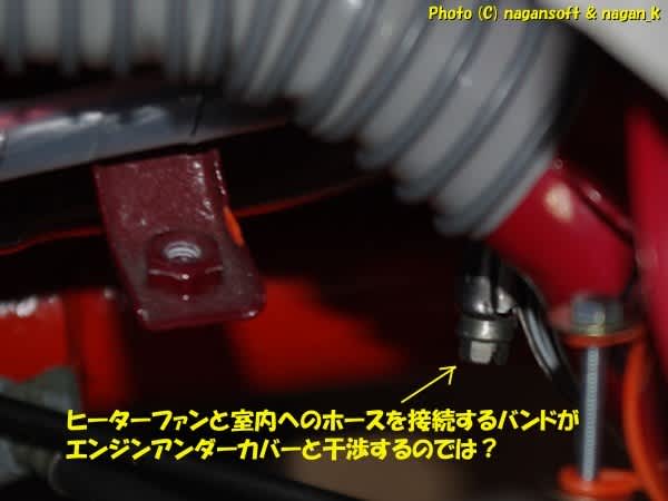 おっとそうだった。室内へ向かうホースを縛るバンドの締めネジ位置がエンジンアンダーカバーと干渉する位置関係にあるかも?だったのを思い出す。