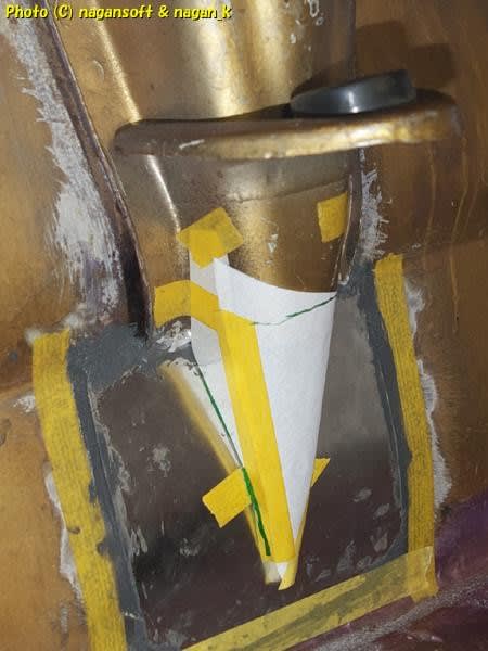 水抜き穴に段ボールで耳栓のごとく差し込みまして、それをガイドにして断面を写し取る道具を当ててみます。