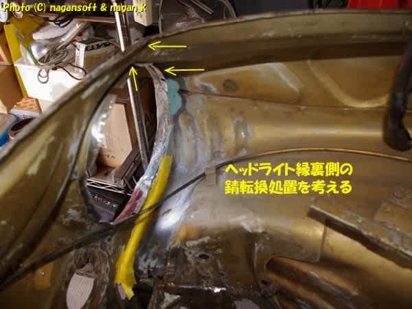 ヘッドライト縁上半分の裏側がまだ錆処置していないんです。