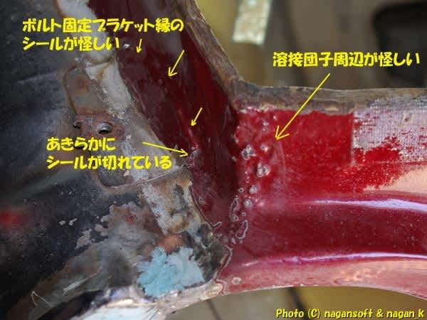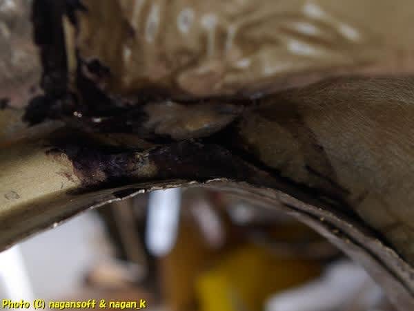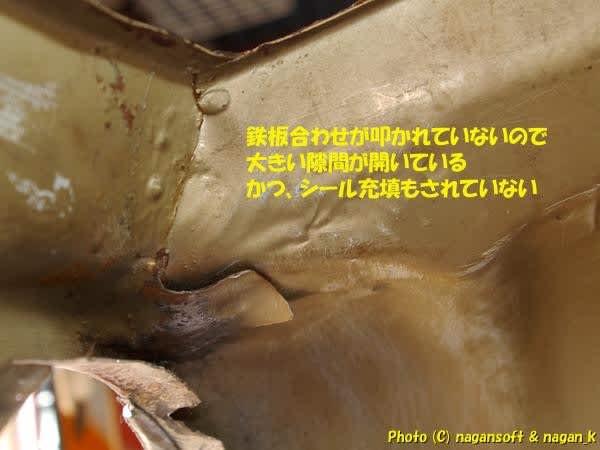 鉄板合わせ部分をスポット溶接してあるののですが、その鉄板縁を叩いておらず隙間がビロビロと大きく開いてます。かつ、シールも充填されていないのです。