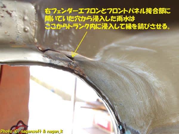 フェンダーエプロンとフロントパネル接合部に開いていた謎の穴から入った雨水はここからトランク浸入して縁を錆びさせてました。