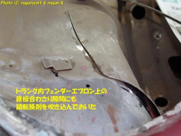 トランク内フェンダーエプロン上の鉄板合わせ部分の隙間にもレノバスプレーを吹きこんでおきました。