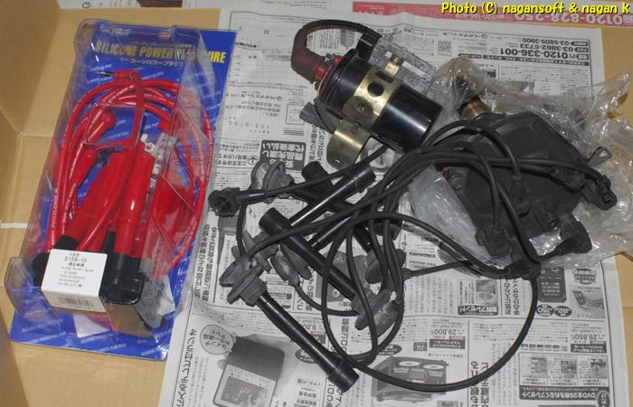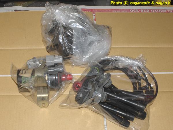 右の黒くて汚らしいものが、保守部品のつもりでヤフオクで味噌くそ価格で落札しているデスビ、プラグコード、コイル、イグナイタのセットです。ちなみに、クラウンワゴン(E-GS130G)から取り外したものではなく、E-GS151H型式のクラウンから取り外されたものです。