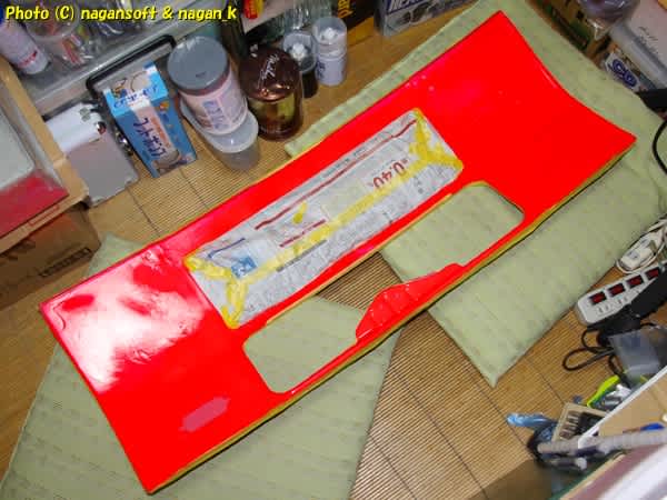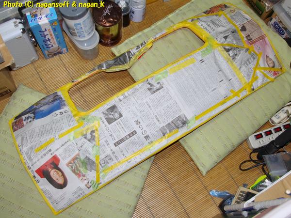 リヤエンジンフード裏側追加塗装をするために表側を新聞紙マスキングです。