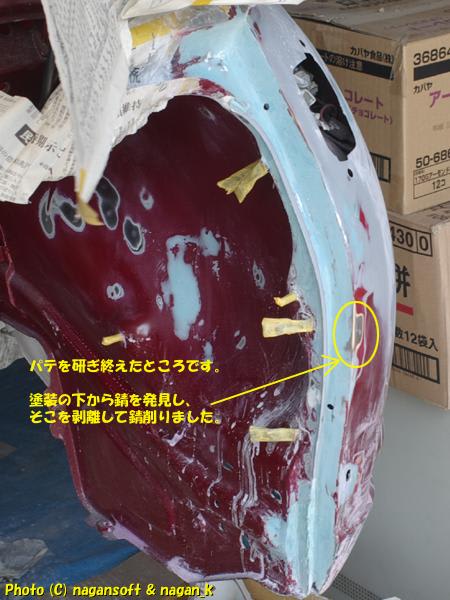 3時間ほどかけて、パテを研磨です。もちろん錆も削り取ります。