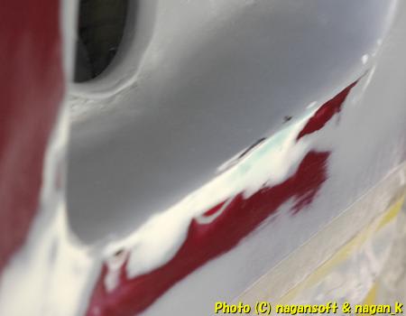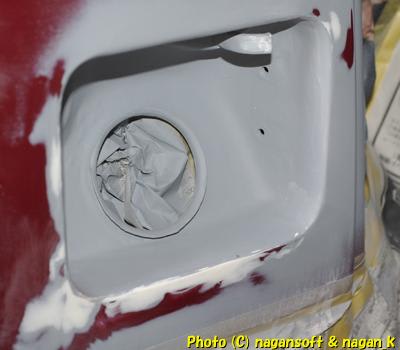 このパテが硬化するまでの間を、右リヤフェンダーアーチで、巣があった部分に、厚付けパテをなすくりです。