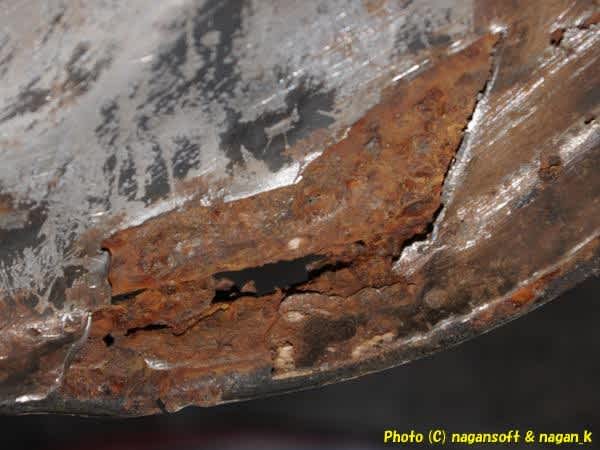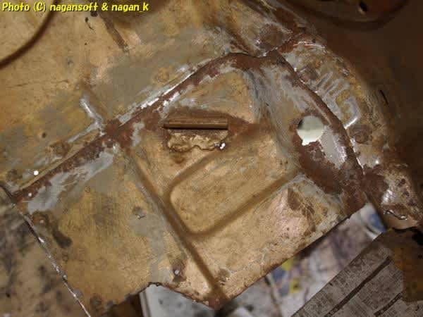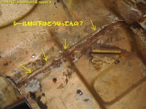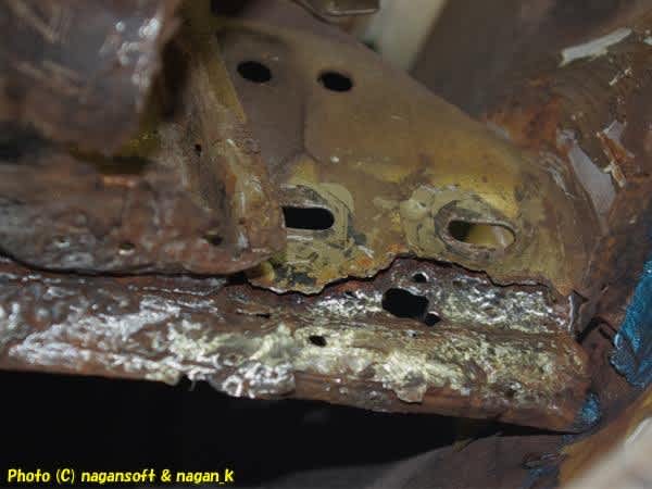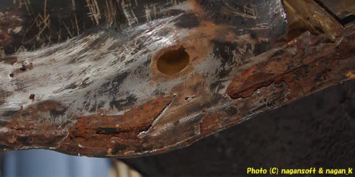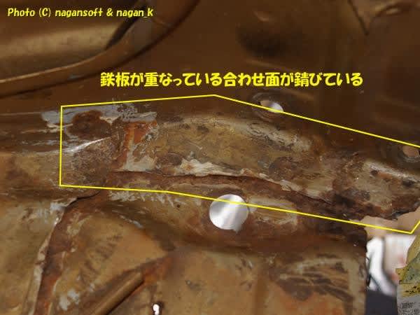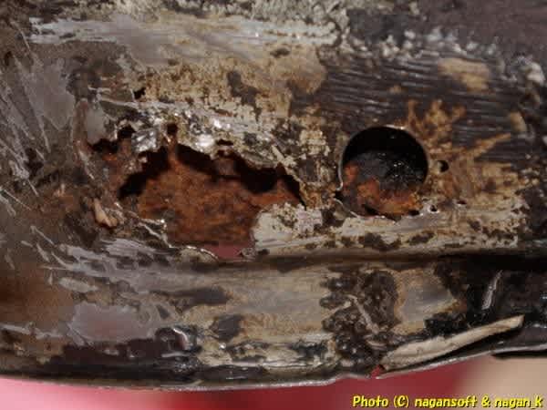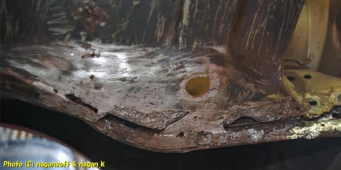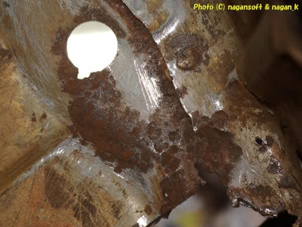 現状でハンマー打検して崩壊する箇所があるならしてしまえ。鉄板の強度があるのかよ。って叩きまくって、下に錆クズがボロボロと落ちたりして、その結果、錆びているけど強度はあるだろうと判断しました。