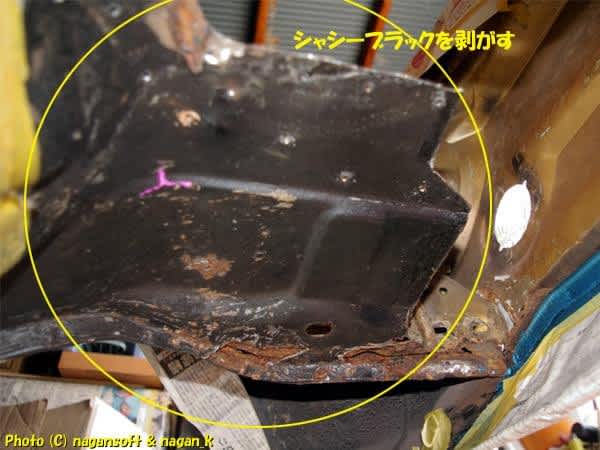 車体下に潜り込んで仰向けになって落ちてくる錆クズを顔に浴びながら、頑張って苦行の錆削りです。