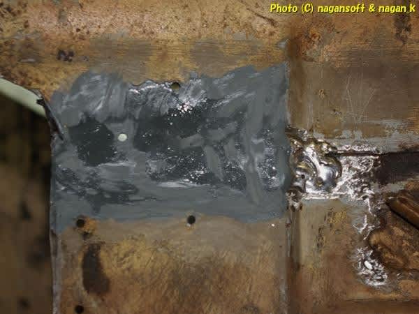 バルグヘッド鉄板が密着しておらず大き目の隙間が開いてます。もちろんそこは錆の温床となっていますので錆転換剤(レノバスプレー)を吹き込みます。