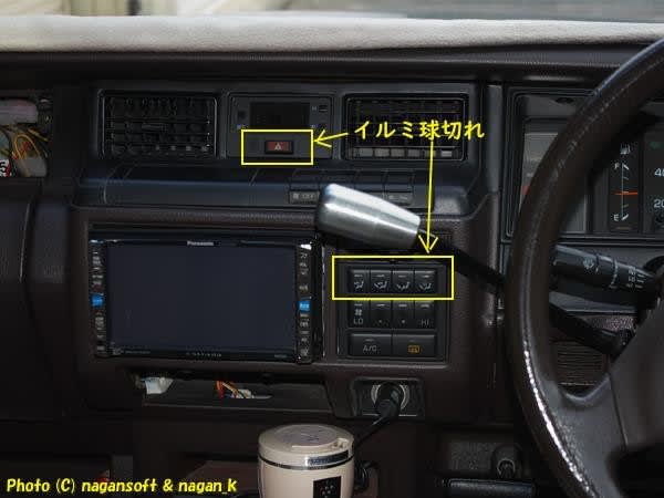 非常点滅ボタンとエアコン操作パネルの一部イルミが球切れしている。