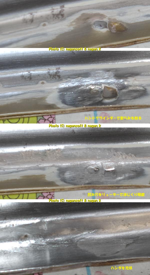 右上コーナー角のスポット溶接ひずみも、ハンドグラインダーで飛び出し研磨とハンダ修正で対応しました。(これの作業写真も省略です)