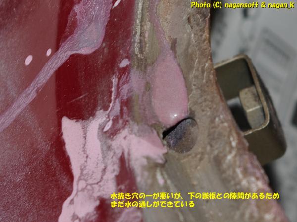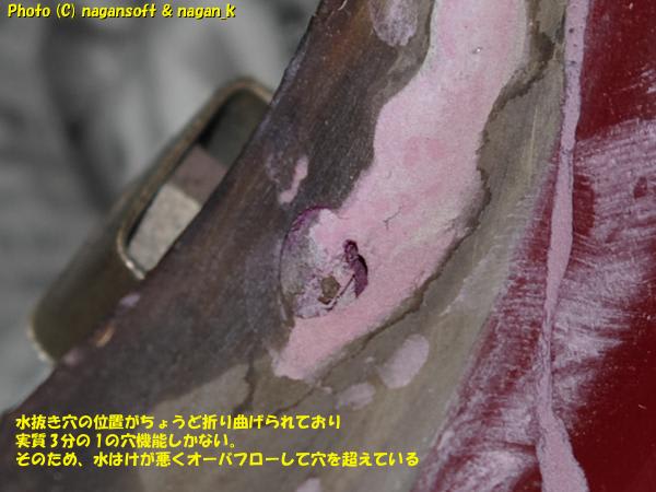 そもそも水抜き穴が裏の鉄板と接しているからいけないのよ。そんなところに水が入ったら水の浸透圧で鉄板合わせの隙間にしみこんでいくでしょ。