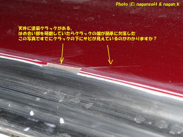 天井のリヤガラス側の角部分から塗装クラックが入っていたのです。今回ガラスはめ合い部を研磨していくとクラックの端がポロっと行きました。