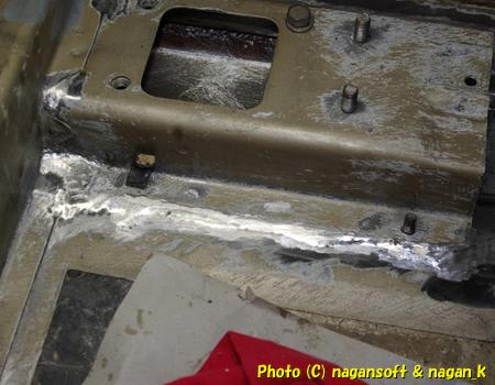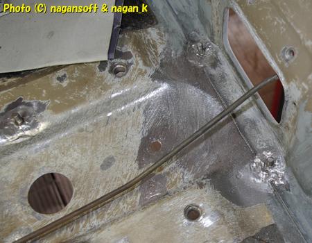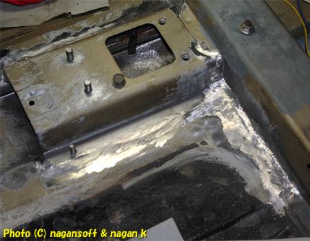 左後ろ床とセンタートンネルと接する部分の余剰ハンダも研磨しました。