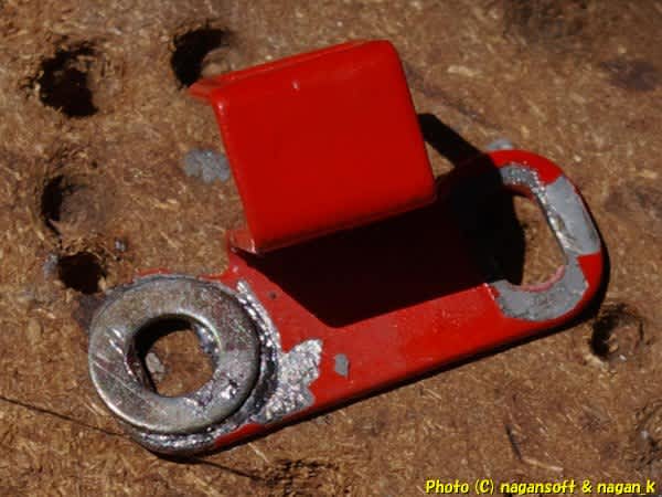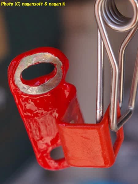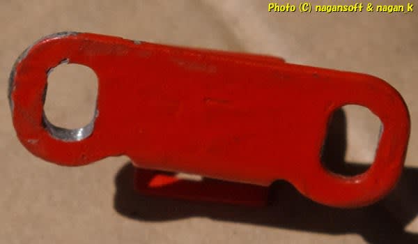 車体の赤色塗料にて筆塗りしました。もちろん貼り付けたワッシャー部分は塗装せずにメッキ金属肌状態ですね。