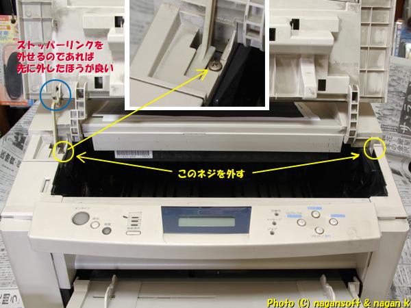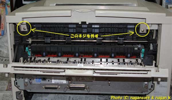 背面用紙送りカバーをあけたところにあるネジ2個を外します。