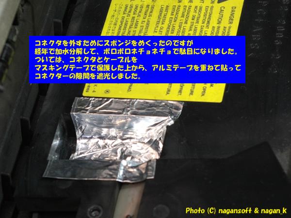 今回はアルミテープを用いましたが、もしケーブルが断線してアルミテープに触れると電気が流れて2次的トラブルになりやすいので、できたらゴム系のテープを用いるべきだと思います。