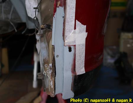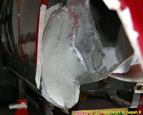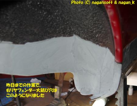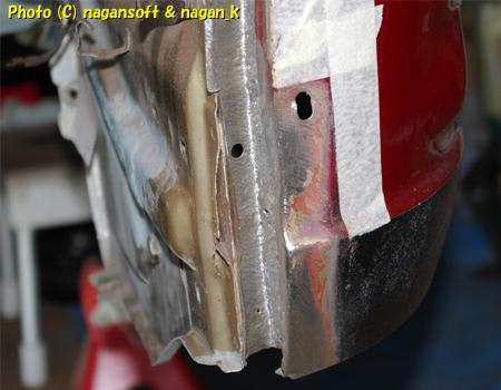 まずは前日までに作業した右側のリヤフェンダー大錆び穴の部分です。