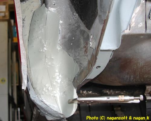 そして、私は、前日にやり残した、フェンダー内の大錆び穴にパッチ鉄板をハンダ付けしました。