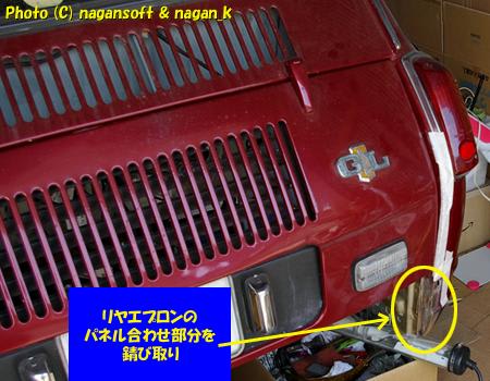 私がハンダするのに車体の下にもぐったりでたりを繰り返すので、作業の邪魔にならないところで、リヤエプロンが被さる部分のパネル合わせ周辺の錆び取りを指示しました。