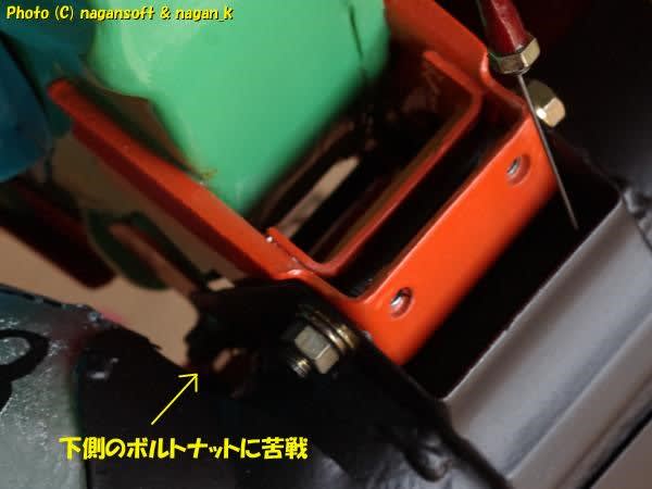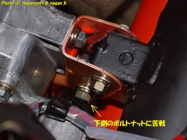 右側ブラケットの下側ボルトナット。通すのも締めるのも苦戦です。