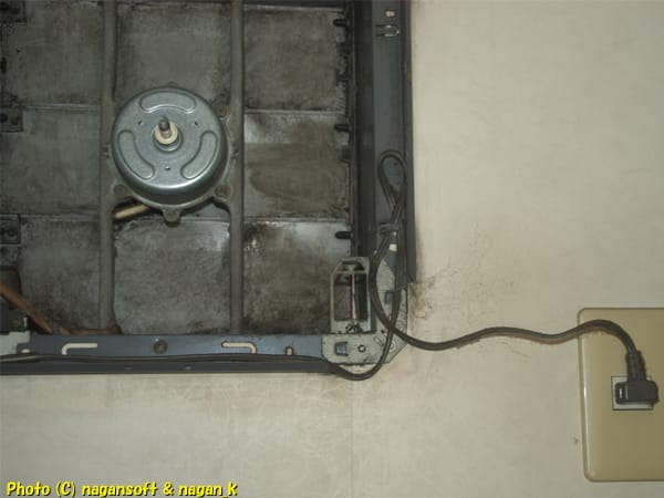 換気扇カバーを外して、電源線がどのように配置されていたのか記録写真撮影。
