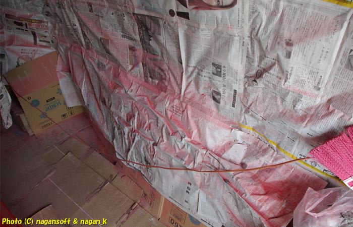 それでも新聞紙についたミストが巻き上がらないように慎重に折りたたみながら壁から剥がしていくのはなかなか手間でした。