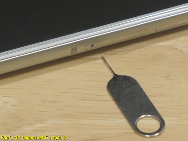 スマホ側面にSIMスロットがあり、トレーを出すためには、小さい穴に小さいピンを突っ込みます。
