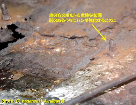 前日までに、センタートンネルの床の錆び取りと、すぐ横のトンネルカバー取付けボルトの付け根がサビで朽ちていた部分を綺麗に錆び取りまで完了しています。