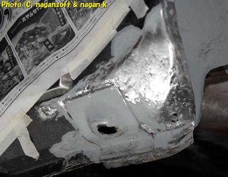 私の作業は、7月16日にハンダを盛ったままで放置プレーしていた、左リアジャッキポイント周辺の盛りハンダを成形です。
