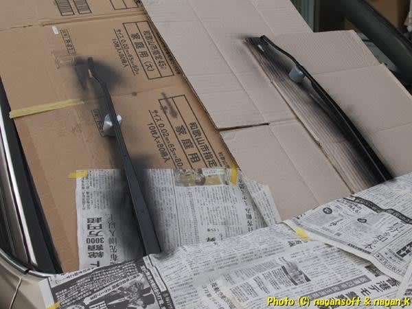 ワイパーゴム装着前にブレードフレームをシャーシブラックでシューって塗装です。