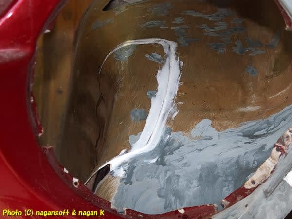 シール材を塗ってから、リベットにてカツンとしっかりかしめます。パッチ鉄板がフロントパネルと固定できたので、フェンダー側をハンダこてで炙りながらハンダ融着です。
