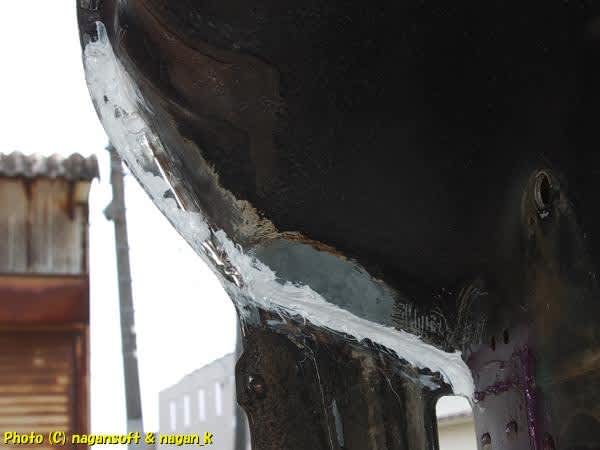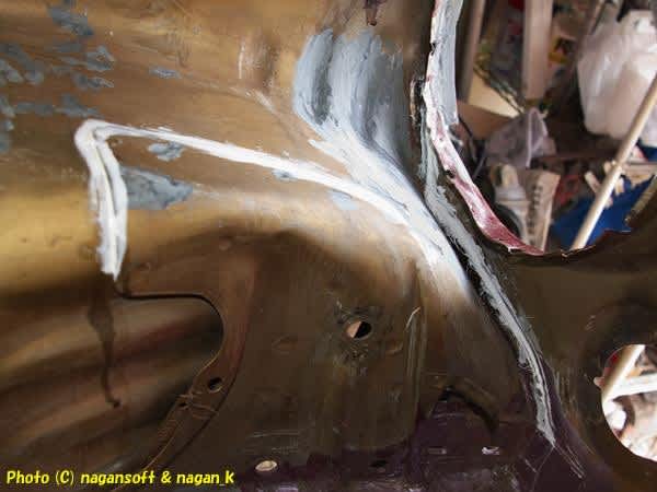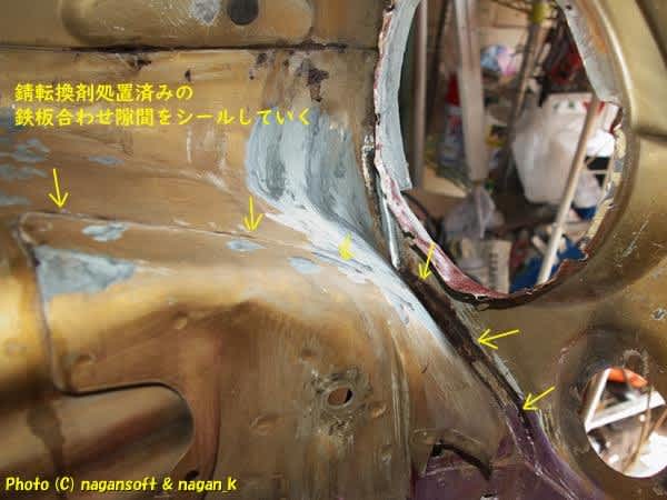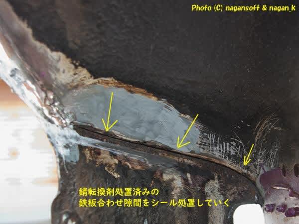 もったいないなー、鉄板合わせ部分で錆転換剤処理している箇所にシール材充填してやれと考えます。