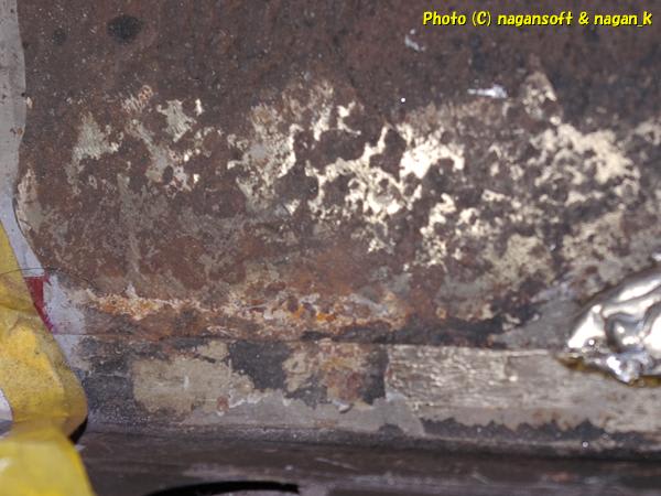 運転席フロア梁の、フロントシートフロアとの立ち上がり部分の一部のサビを処置します。