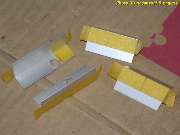 ガイドラインのつもりでマスキングテープを貼って、まずは確定している2か所のボルト通し穴を開けました。