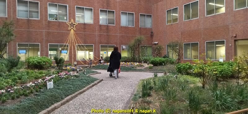 いつもの大病院です。コロナをもらってはいけないと人が多くいるところを避けて病院の中庭に陣取るんです。