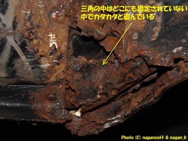 この先っちょの三角部分は内部でカラカラと動くのです。つまり鉄板がはがれて鉄屑になって内部に転がっているってことです。