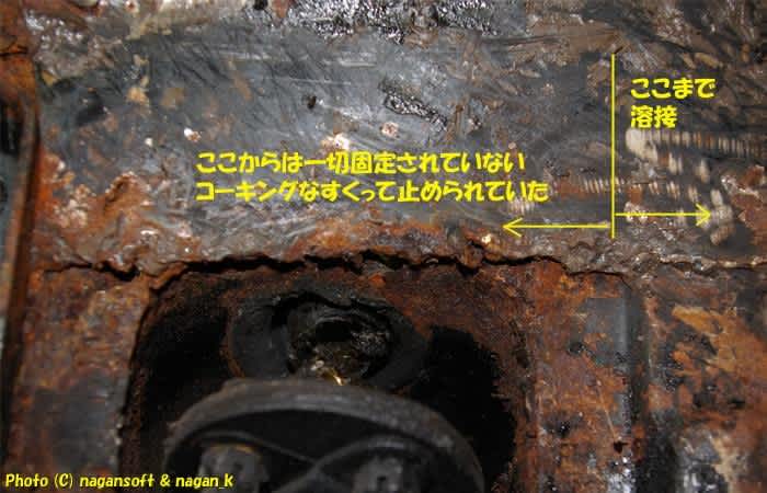 つまり、1枚の接ぎ鉄板で、一部はべっとりと縁溶接してあり、ある辺はまったく固定されずに宙ぶらりんで、コーキングで埋めて貼り付けとしている。