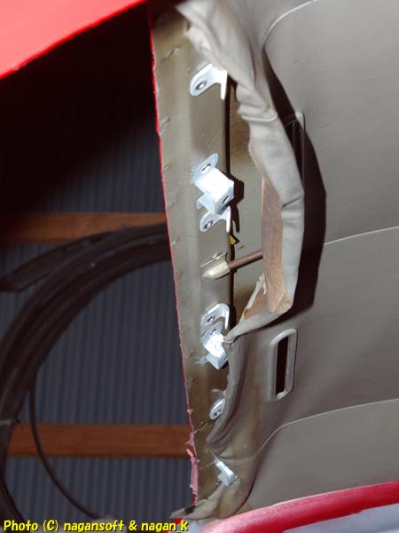 また中腰になりまして、内貼りを右手でよけながら、左手だけでリベッターを握りしめて打ち込んでいきます。
