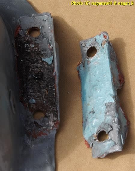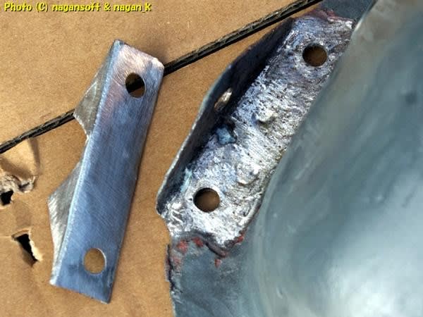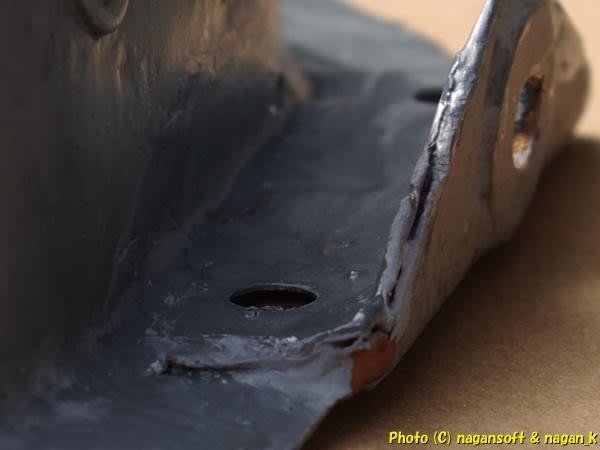 私は、カバー本体側の錆転換部にも、パッチ鉄板の鉄肌露出部分にも、しっかりとパテをなすくって合体させました。