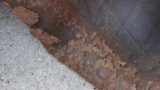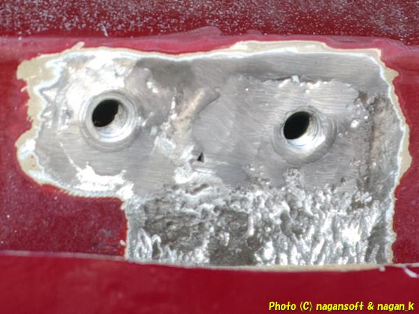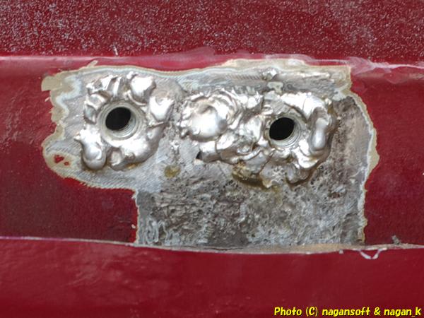 車体側から処置します。錆を削ったりしたのと、ブラインドナットの隙間を埋めたいので、再度ハンダを盛ります。