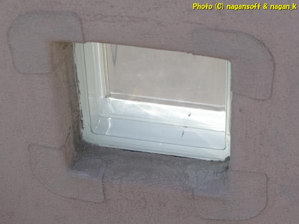で、前オーナー様の変なデザインこだわりで、屋上壁に明り取りで小さいガラスが埋め込まれているのですよ。