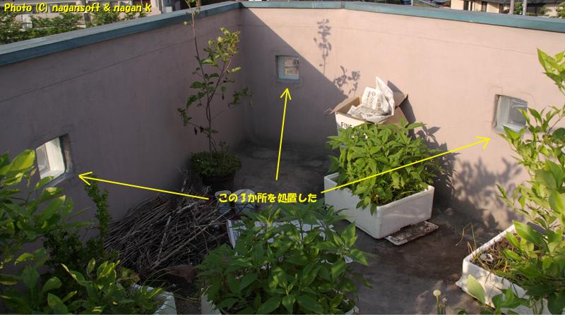 で、作業開始が遅かった(嫁が屋上に水を撒いたのですぐに作業できず夕方から始めた)ので、3か所しか施工できず。