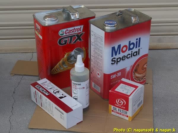 Mobil Special 5W-30 は以前にオイル交換した残りです。300mLぐらいあり。そいつを入れて…