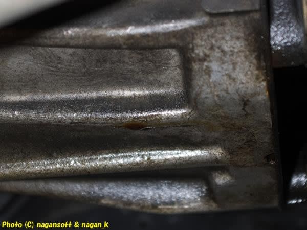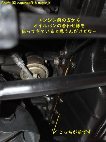 あいかわらずエンジン前の方からオイルパンの合わせ目を伝ってエンジン後ろへ伝ってきている….。ちなみにエンジンは微妙に後ろ下がりなんです。