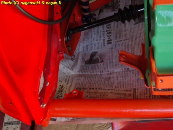 もちろんフレーム裏、エンジンルーム下も新聞マスキングです。